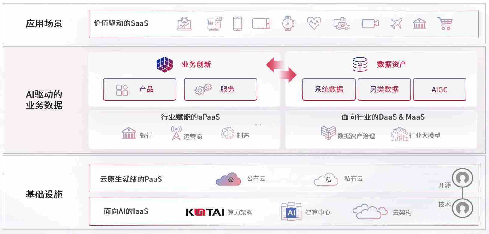 数字时代,,,,围绕企业数字化转型的关键要素,,,,PA旗舰厅数码开创性的提出数云融合战略和技术体系框架,,,着力在云原生、、数字原生、、、、AI原生和信创产业上架构产品和服务能力,,,为处在不同数字化转型阶段的快消零售、、、汽车、、、金融、、医疗、、政企、、、、教育、、运营商等行业客户提供泛在的敏捷IT能力和融合的数据驱动能力,,,,构建跨界融合创新的数字业务场景和新业务模式,,,助力企业级客户建立面向未来的核心能力和竞争优势,,,全面推动社会的数字化、、、、智能化转型升级。。。