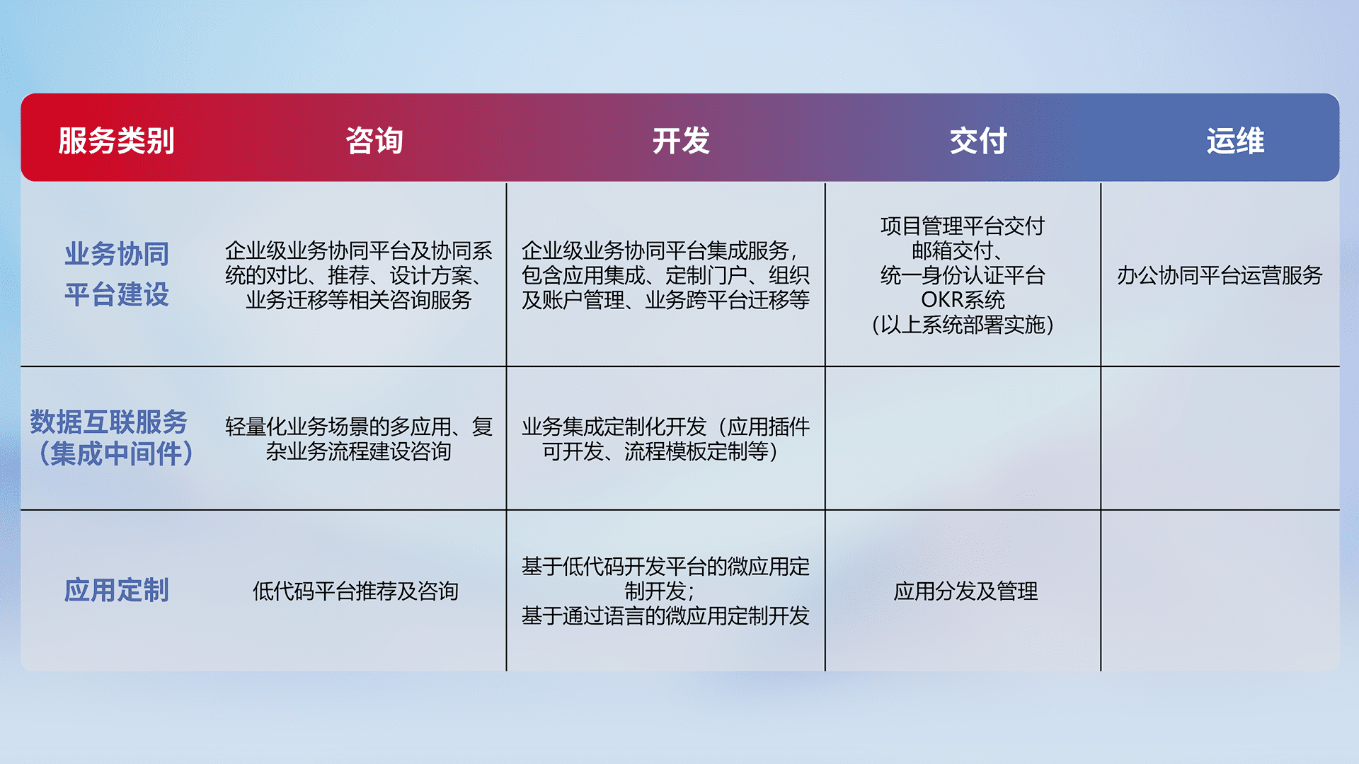针对钉钉、、企微、、IDaas等平台级产品提供产品的规划、、、方案、、、交付、、、定制化开发等服务,,实现如统一协同办公、、、、智能客户服务、、混合会议管理、、智能数据查询、、、、等业务场景,,,实现数字化转型。。。
