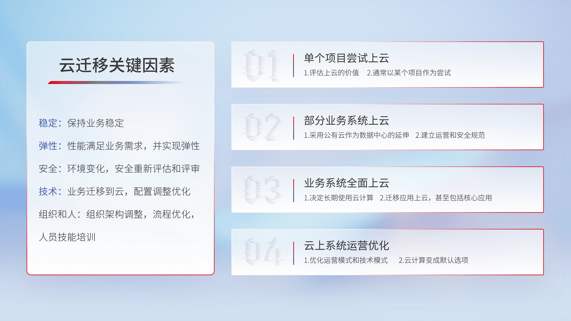 结合实际业务,,从规划设计、、云平台选型、、、、云原生改造、、、数据迁移、、、集成交付,,,迁移全过程为客户识别最佳上云路径,,,,做好风险识别管理,,设计网络架构、、、、身份权限、、安全审计合规、、、、操作审计、、、、日志审计、、、监控告警策略、、、、多站点容灾设计等,,,,对云上基础设施进行整体规划,,提升IT治理水平,,,以满足弹性、、、高可用、、、高性能的需求。。。。