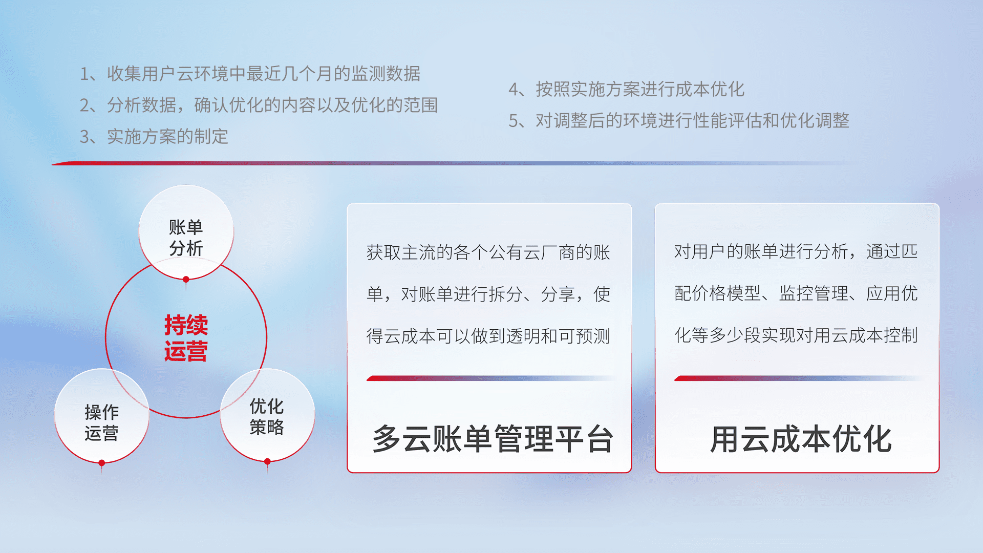 通过多云纳管,,,以统一的资源数据模型把客户的云资源进行抽象和封装,,,进而实现对多云资源的统一操作,,,保障云资源管理的可靠性、、、稳定性与可用性。。。量身定制化运维内容,,,配置、、、开发运维、、、、补丁管理、、备份、、、监控、、、认证和访问管理、、、、审计和日常巡检等,,保障在用云过程中的可靠度,,稳定度以及高可用率。。